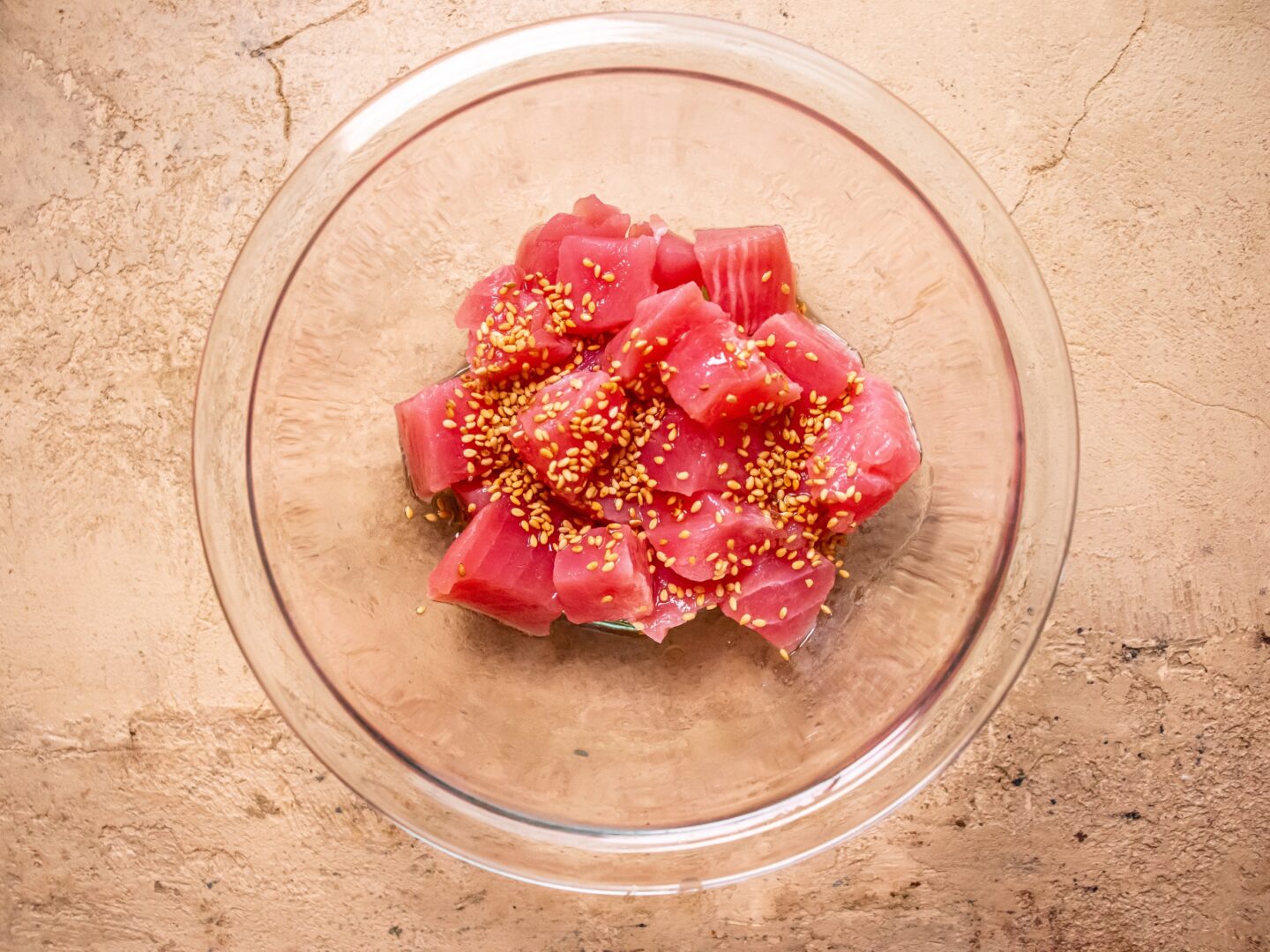 To make this poke bowl, start by dicing your tuna into bite-sized pieces and drizzle two tablespoons of the dressing over the top. Add sesame seeds and toss until coated. Reserve the remaining sauce and let the fish marinate while you prepare the veggies.
