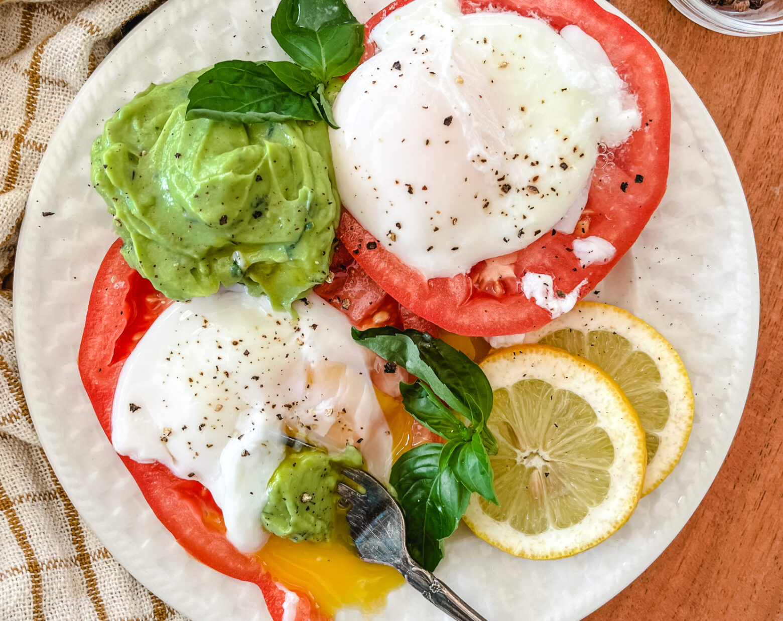 To assemble your Paleo Eggs Benedict, serve your poached eggs over slices of tomato, and top with the avocado cream. Garnish with lemon slices and more herbs if you wish, and top with freshly cracked pepper. Enjoy!
