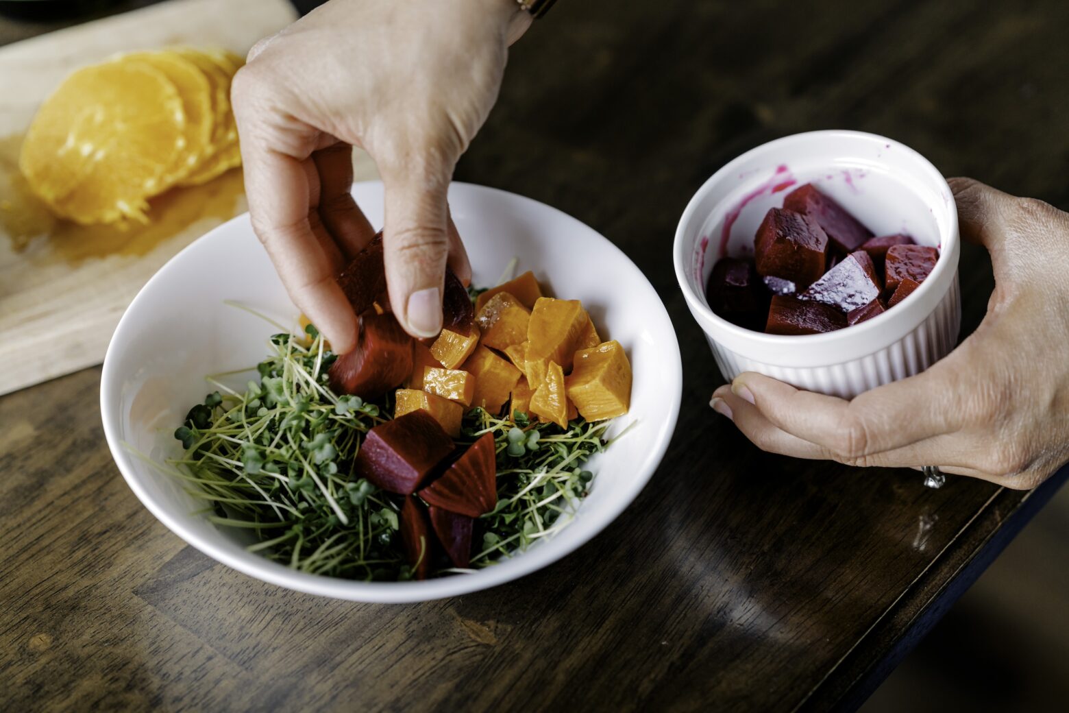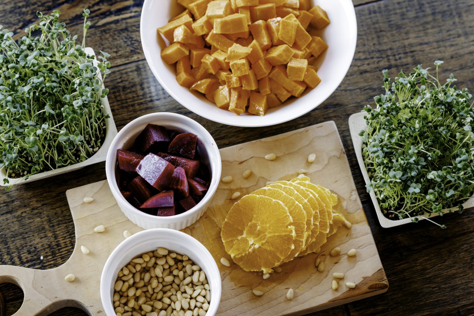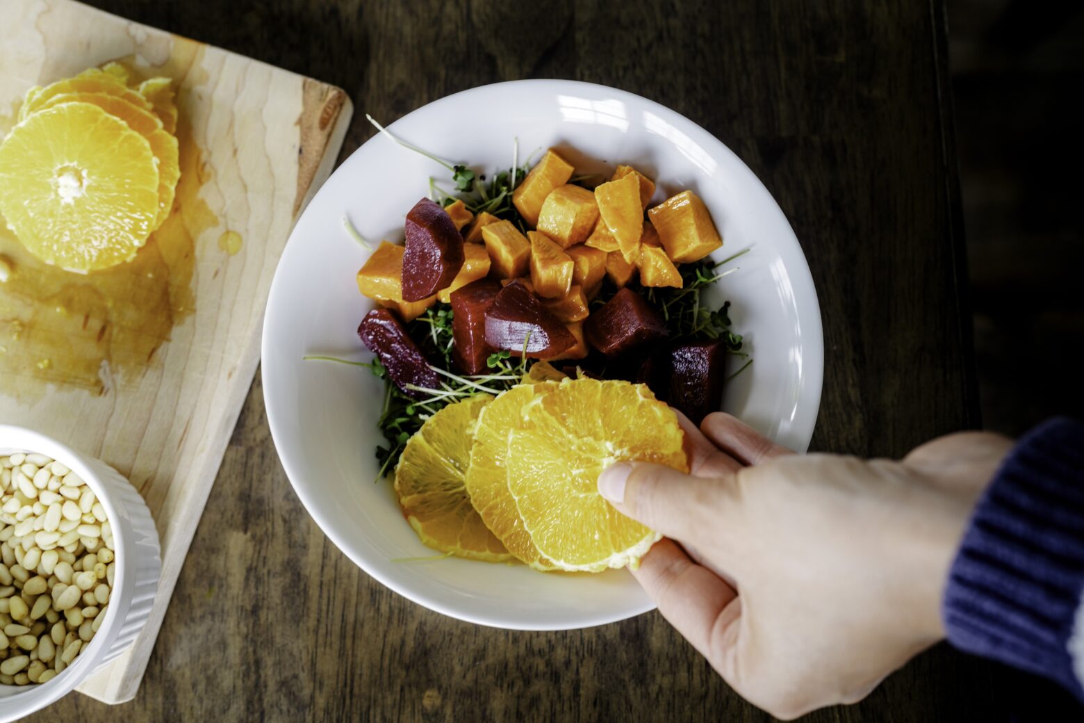 Assemble dry ingredients on a large plate in the following order: broccoli microgreens, pickled beets, sweet potato, orange slices, and roasted pine nuts.