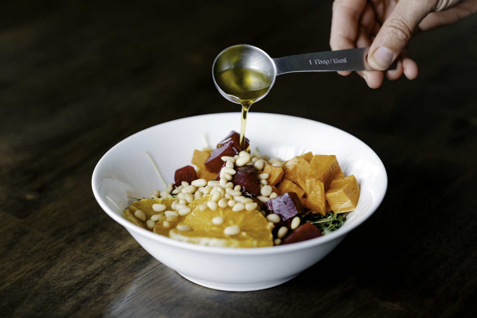 A simple olive oil and vinegar drizzle serves as a light dressing. Feel free to adjust the ratios to your taste; however, we recommend a 2:1 ratio of olive oil to balsamic vinegar for the most balanced vinaigrette.
