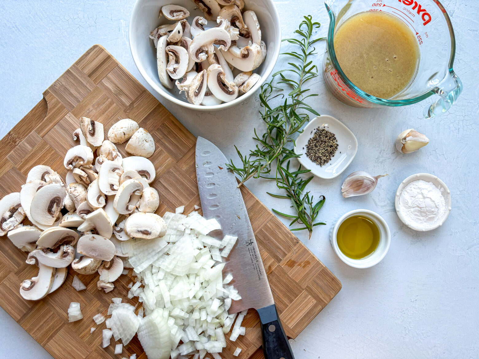 While mushrooms and onion cook, make the slurry in a bowl. Stir arrowroot powder into beef broth until combined. Set aside.