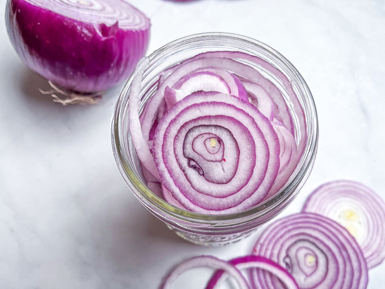 Pickled Red Onions are the ultimate topping to elevate burgers, salads, eggs, and more. Their crisp texture combined with sweet and tangy flavors make them a must-have in your fridge. Not only that, but red onions are antibacterial, full of antioxidants, and boost digestive health. Our Picked Red Onion recipe takes under 10 minutes to prepare and is ready to eat in just half an hour.
