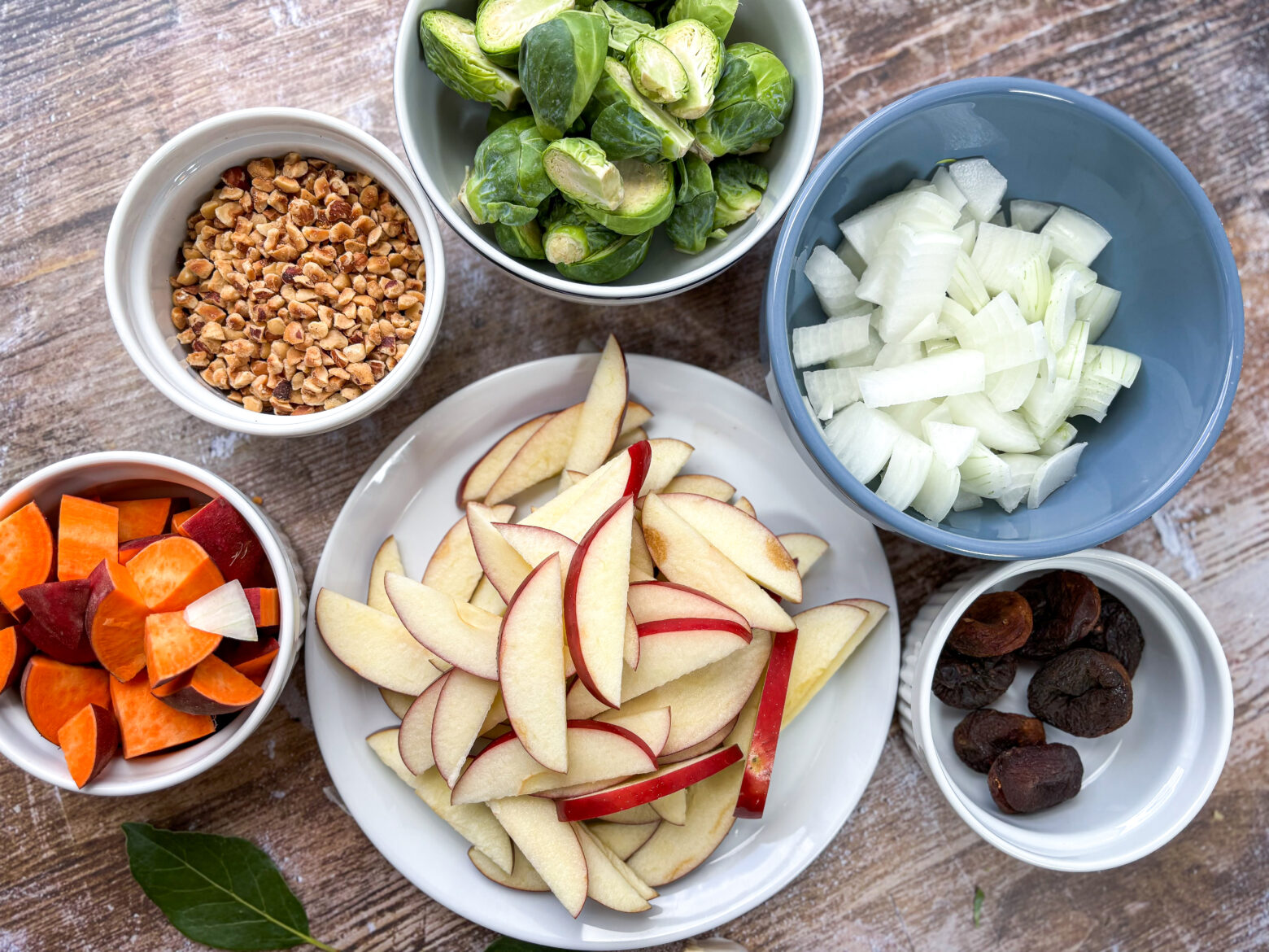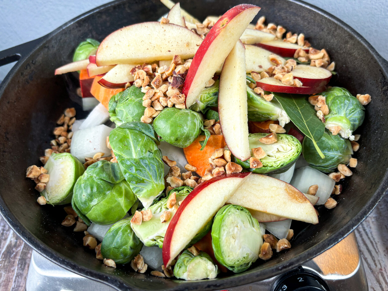 4. In the same skillet, add onions, sweet potatoes, Brussels sprouts, bay leaves, apples, and 1 ½ cups hazelnuts. Cook for about 7-10 minutes, stirring occasionally so nuts do not burn.