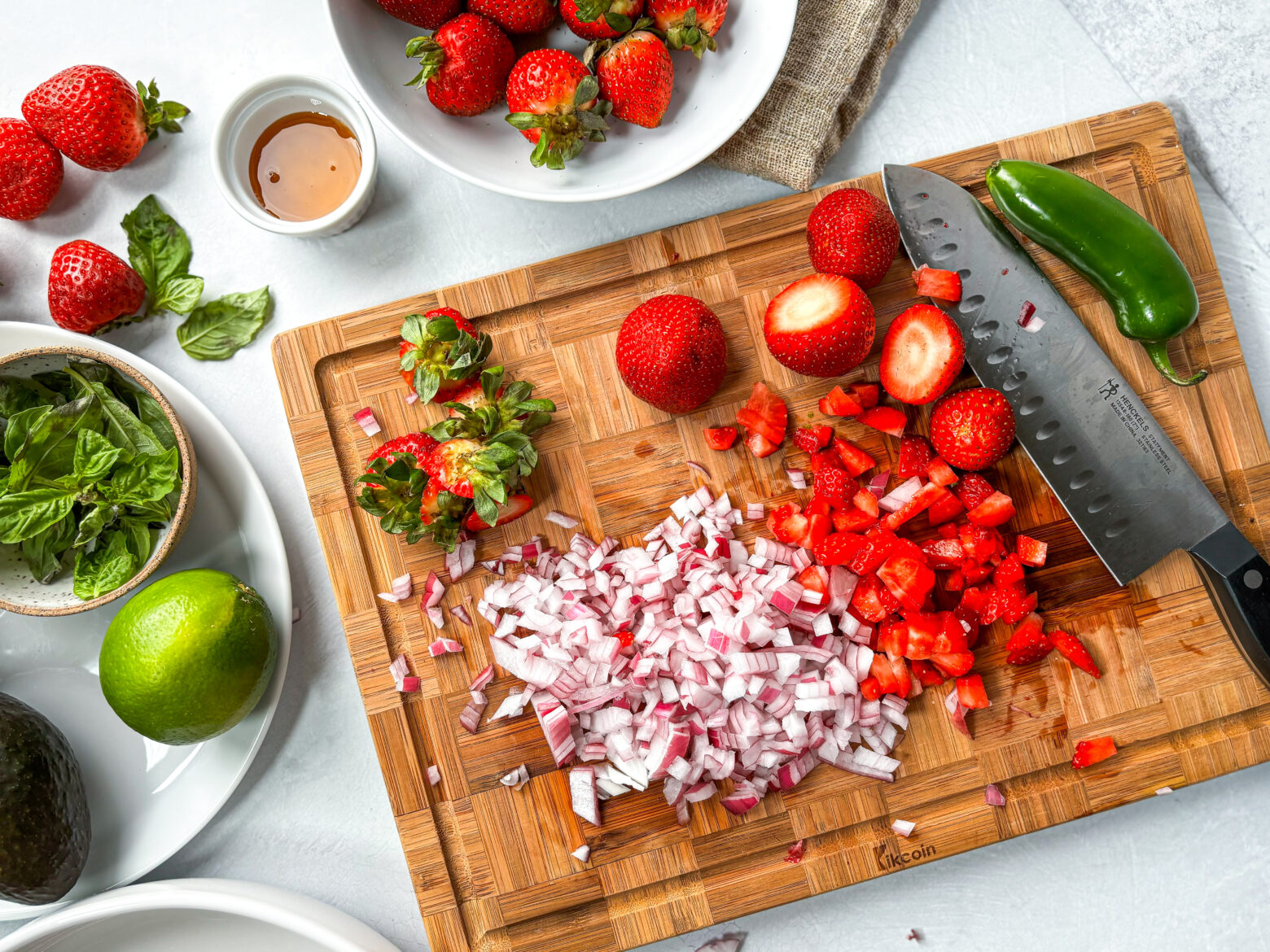 Throw avocado, red onion, basil, strawberries, pepper, lime juice, and jalapeño into a bowl and mix.